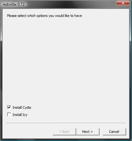 5. Selecione apenas a opcao "Install Cydia" e clique em next6. Plugue seu iPhone / iPod e desligue-o, depois clique em "Next"